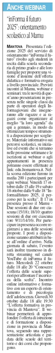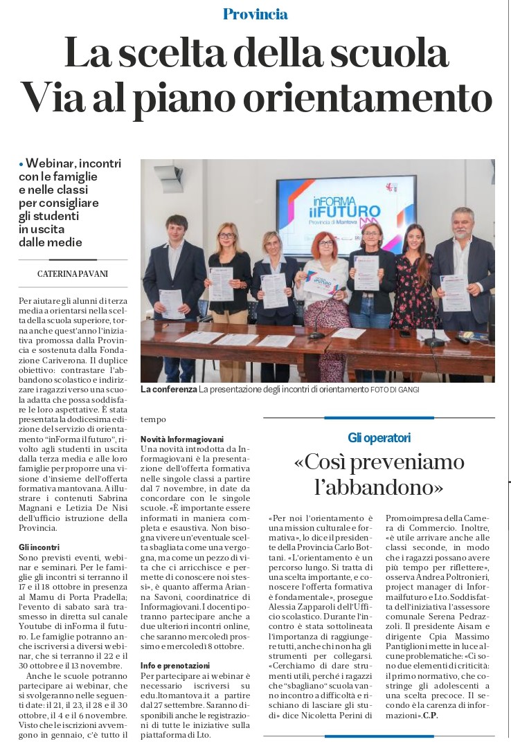 L’edizione 2025 del servizio di orientamento “inFORMA il FUTURO“, il servizio di orientamento rivolto agli studenti che terminano la scuola secondaria di primo grado e alle loro famiglie. L’iniziativa è promossa dalla Provincia di Mantova in partenariato con l’Ufficio Scolastico Territoriale, la Camera di commercio di Cremona-Mantova-Pavia, la Rete provinciale Informagiovani, For.Ma Mantova e PromoImpresa – Borsa Merci, con il supporto operativo di LTO Mantova.